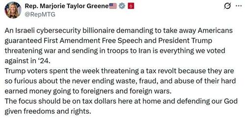 He said that second, “Military strikes on Iran require Congressional authorization.” He followed with the final criticism of, “This threat isn’t about freedom of speech in Iran; it’s about the dollar, oil, and Israel” – while reposting Trump’s original message.
