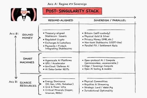When I looked at all this and realized that all major powers are jockeying around these same themes, what came to mind for me was a kind of barbell positioning between “Mr. Regime” and a Parallel System (including “freedom tech”) across two axes: