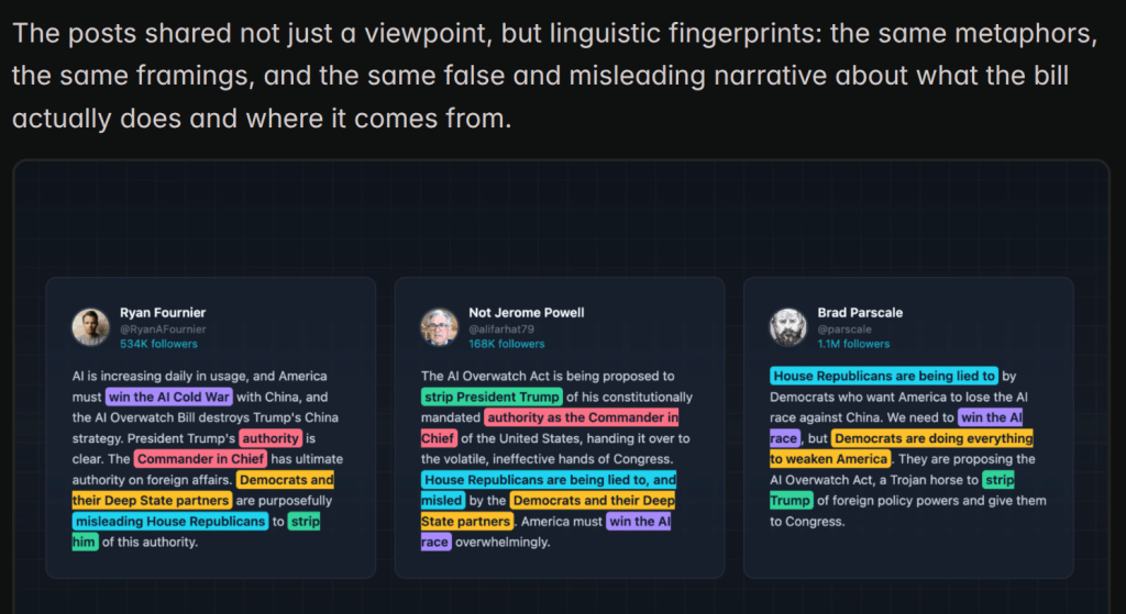 The latest case in point: K Street policy and lobbying firms appear to have leveraged a bunch of right wing influencers to launch a coordinated social media campaign attacking the AI Overwatch Act, which would tighten restrictions on the export of advanced artificial intelligence chips to foreign adversaries.