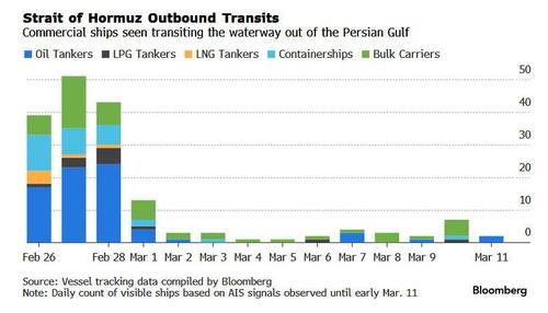 Shipping along the narrow strait has all but halted since the start of the U.S.-Israeli war on Iran more than a week ago, preventing exports of around a fifth of the world’s oil supply and sending global oil prices surging to highs not seen since 2022. Some ships – mostly Iranian VLCCs and Chinese tankers carrying embargoed products – have resumed transits with Iran vowing it would only attack western-linked ships, we reported earlier.