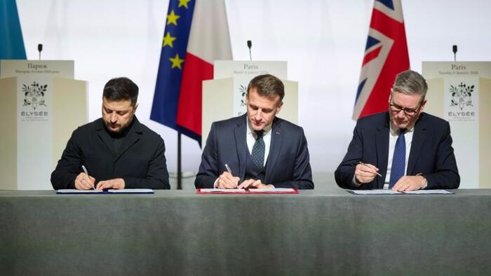 Zelensky, Macron, and Starmer sign the ‘declaration of intent’ in Paris on January 6. Source: Office of Ukrainian president.