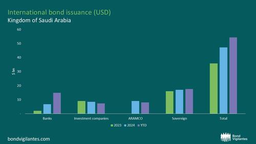 We can see the scale of the change in issuance of international bonds, which has soared in the past few years. In 2023, KSA banks issued $2.0bn of bonds, accounting for around 6% of total issuance from the Saudi complex. In 2024, this grew to $6.8bn (14% of total), while so far this year banks have already issued $14.9bn of bonds, comprising 27.4% of all Saudi issuance. And it’s not just the banks that are issuing more debt internationally. KSA’s funding needs mean that it is issuing through every vehicle at its disposal, including cash-rich Aramco and its sovereign wealth fund (PIF). Total Saudi debt issuance ballooned from $36bn in 2023, equating to around $3bn per month, to $54bn year-to-date or around $6.4bn per month.