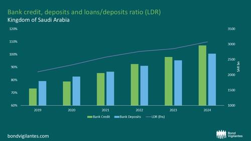 A glance at financial sector balance sheets shows that the need for international funding is structural – it is here to stay. Overall bank loans have grown at a compound annual growth rate (CAGR) of 14% since 2019, with deposits growing by just 8% over the same period. In cash terms, loans have doubled from SAR 1.5tn in 2019 to SAR 3.0tn as at end-2024, while deposits have increased much less, from SAR 1.8tn to SAR 2.7tn. In 2019, therefore, the financial system had more than enough deposits to fund the economy’s credit needs; by 2024, this is patently no longer the case. In fact, the system’s loans/deposits ratio has weakened from 86% to 110% over the period. The conclusion is simple: banks are now dependent on wholesale funding if the current rate of credit growth is to be maintained.