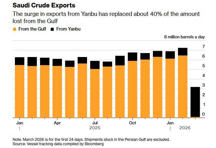 Saudi Arabia, along with the UAE, is one of only two countries in the region that can divert significant amounts of oil to bypass Hormuz, providing a crucial lifeline for supply. And since the start of the war, the Saudis had been rerouting oil through the 1,200 kilometer (746 mile) East-West pipeline to the western port of Yanbu. At the same time, it’s quickly amassed a huge armada of tankers that have streamed toward the Red Sea to load the oil and are now piling up around the port.