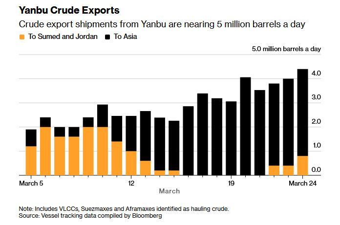 Crude shipments for export from the Yanbu South and Yanbu North terminals averaged 4.4 million barrels a day in the five days to Tuesday, according to vessel tracking data compiled by Bloomberg. Flows through Yanbu have been rising steadily after the kingdom moved quickly to pump crude through the 746-mile conduit to the Red Sea.
