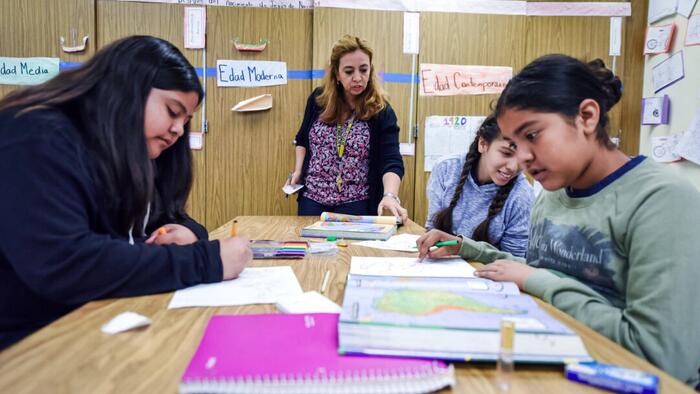 An instructor teaches a Spanish lesson at Franklin High School in Los Angeles on May 25, 2017. Robyn Beck/AFP via Getty Images