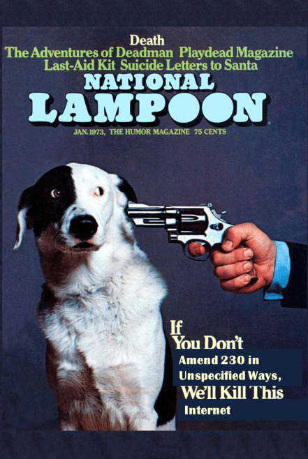 A bipartisan group of the most anti-internet Senators around have released their latest version of a plan to “sunset Section 230.” We went over this last year when they floated the same idea: they have no actual plan for how to make sure the open internet can continue. Instead, their “plan” is to put a gun to the head of the open internet and say they’re going to shoot it… unless Meta gives them a different alternative. Let’s bring back Eric Goldman’s meme:
