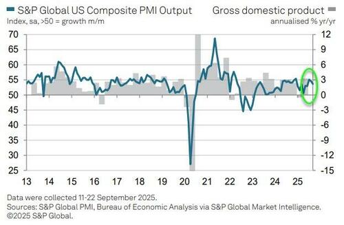 “However, the monthly profile is one of growth having slowed from its recent peak back in July, and September saw companies also pull back on their hiring. Softening demand conditions are also becoming more widely reported, curbing pricing power. Although tariffs were again cited as a driver of higher input costs across both manufacturing and services, the number of companies able to hike selling prices to pass these costs on to customers has fallen, hinting at squeezed margins but boding well for inflation to moderate.
