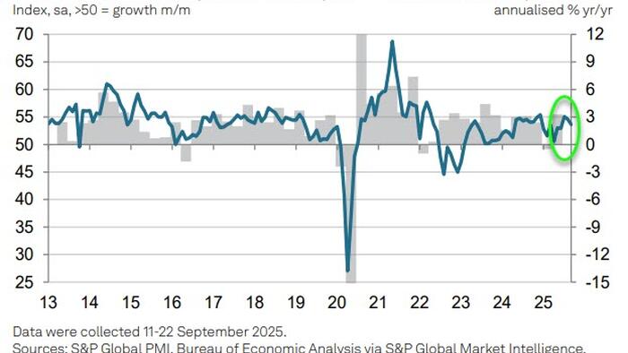 “The inventory build-up of course also hints at some downside risks to future production. While growth expectations across both manufacturing and services also continue to be dogged by concerns over the political environment, and especially tariffs, September encouragingly saw business sentiment improve in part due to the anticipated beneficial impact of lower interest rates.”