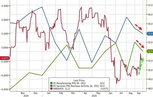 Following August’s big bonce in US Manufacturing survey data, the preliminary September data shows weakness for both Services and Manufacturing (despite strength in the hard data).