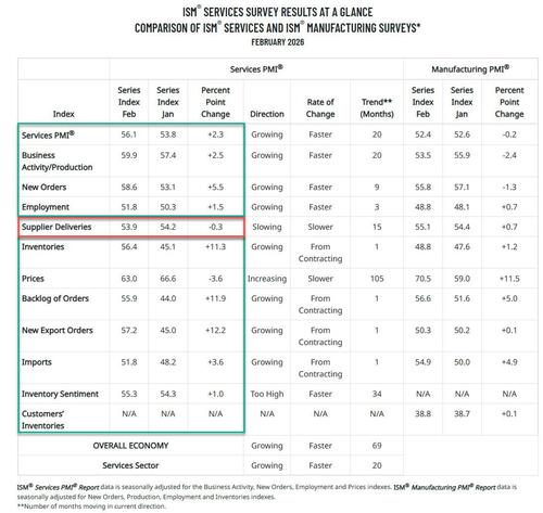 After the Manufacturing ISM print earlier this week came modestly stronger than expected (albeit with the Prices Paid component spiking and sending 10Y yields higher), some were expecting a similar improvement in today’s Services ISM print. What they got instead, was a blowout number, and one suggesting that whatever weakness the US economy was in for much of the latter part of 2025, is now over.
