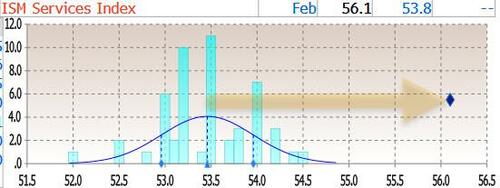 Economists expected a print of 53.5. Not only did the number come above the highest estimate, it was a six-sigma beat to the consensus estimate.