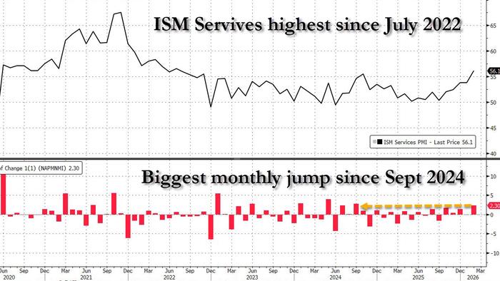 At 10:00am ET, the ISM Services print came out at 56.1, the highest print since July 2022, and was 2.3 higher than the 53.8 reported in January – the biggest monthly increase since Sept 2024