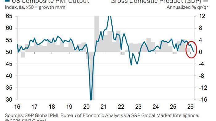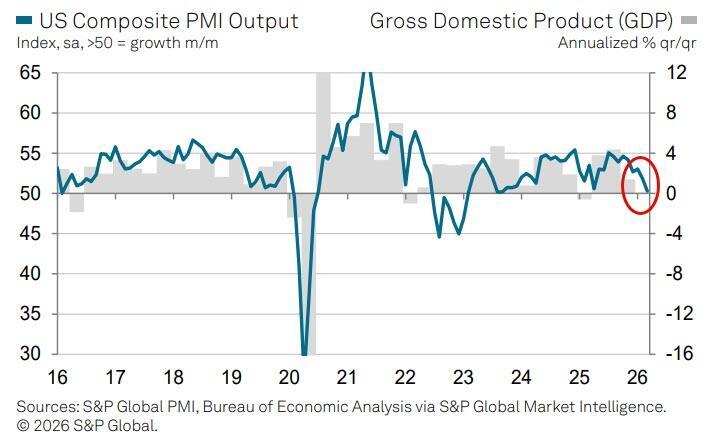 “The PMI survey data show the US economy buckling under the strain of rising prices and intensifying uncertainty, as the war in the Middle East exacerbates existing concerns regarding other policy decisions in recent months, notably with respect to tariffs,” said Chris Williamson, Chief Business Economist at S&P Global Market Intelligence