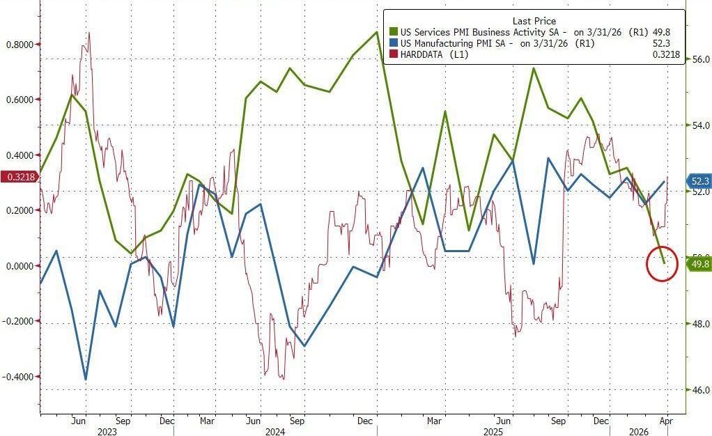 Following S&P Global’s Manufacturing PMI’s better than expected print higher (signaling resilience in the face of March’s war in Iran), the data released this morning showed the US Services Sector experienced a contraction of activity at the end of the first quarter of 2026.