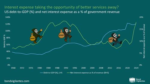 US government debt levels have been soaring in the last 10 years. We find ourselves in a situation where interest payments servicing US debt are well in excess of their defence budget ($800 billion)! With so much money being spent on interest, what are the consequences for citizens in terms of services, and what effect does this have on growth? Is this a downward spiral that is tricky to escape?