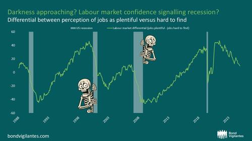 Strain in the labour market is a classic sign of a recession. The Conference Board Consumer Confidence Labor Differential is suggesting some significant deterioration in the availability of work. Spotting recession is easy in hindsight, but perhaps it has already made its way into the house hiding behind the door? The shape looks familiar to that of recessions gone by… could history be repeating itself?