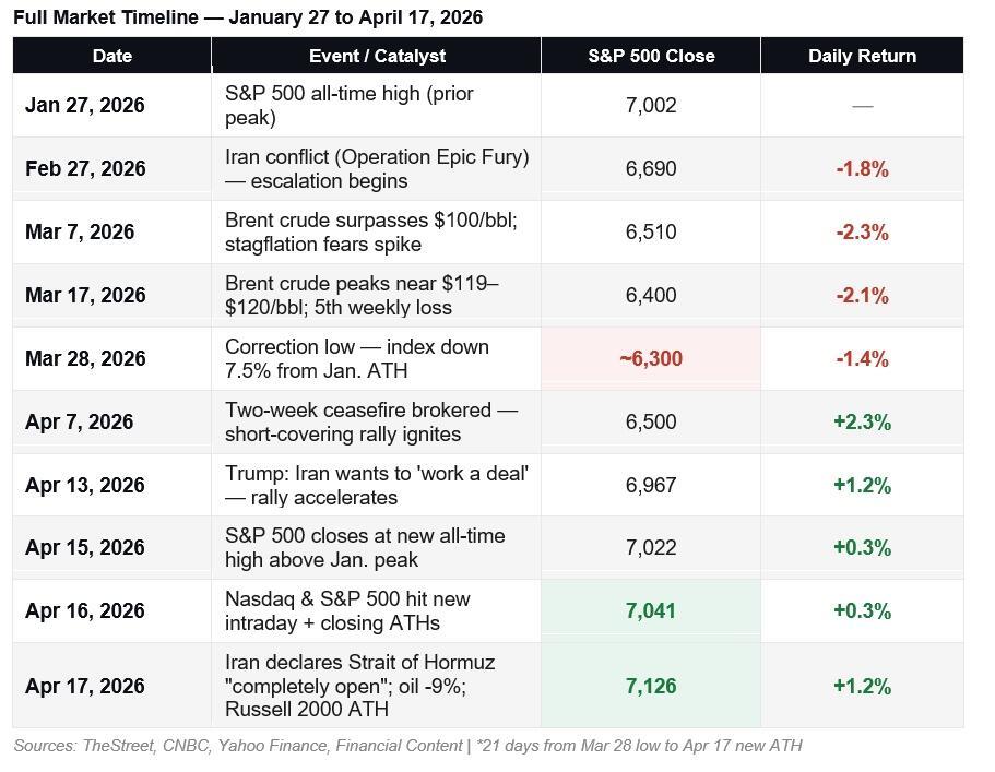 What began as a short-covering rally on April 7th has spent the last two weeks proving the bears wrong. Friday’s close at 7,126, the first finish above 7,100 in the index’s history, up 13.1% from the March lows, arrived alongside one of the most consequential single-session catalysts of the year. Iran declared the Strait of Hormuz “completely open.” Brent crude collapsed 9.1%. The Russell 2000 logged a new all-time high. The short-covering rally that skeptics said would exhaust itself in days has now run for three weeks and taken every major index to record territory.