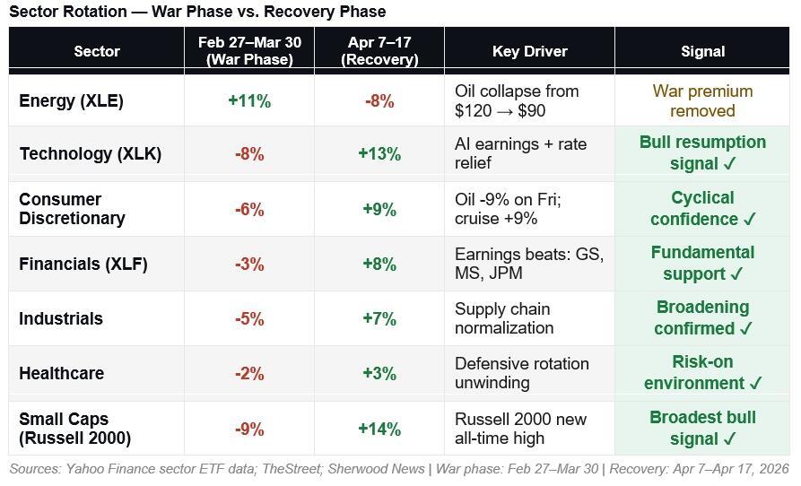 If there is a single dataset that most clearly distinguishes a short-covering rally from a genuine bull-market resumption, it’s sector rotation. Short-covering rallies tend to be narrow; they lift the most-shorted names while leaving cyclical and economically sensitive sectors behind. Genuine recoveries broaden. The sector data from the wartime selloff (February 27 to March 30) compared to the recovery (April 7 to April 17) tells a very clear story.