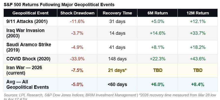 On the other hand, we must also consider the bears’ argument. The argument that this is “just a short-covering rally” with no staying power may be true, but it gets harder to sustain when you study the historical record for geopolitical shocks of comparable magnitude. Across more than 20 major events since World War II, the pattern is consistent: markets recover faster than most investors expect, and the investors who stay disciplined through the short-covering rally phase and into the recovery tend to come out ahead.