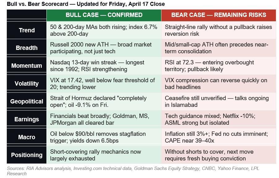 The weight of evidence has shifted. At the start of this week, our scorecard was roughly balanced — three confirmed bull signals against three legitimate bear concerns. As of Friday’s close, the bull case has added three material confirmations: Russell 2000 at a new ATH (breadth), oil’s single-session collapse (geopolitical resolution), and sector rotation into cyclicals (genuine buying, not short-covering alone). The bear case retains one critical point: RSI at 72.3 argues for near-term patience on new entries, not a reversal of the trend.