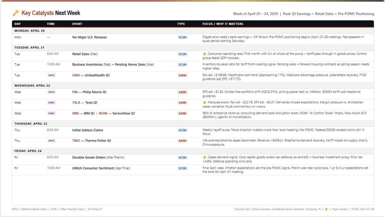 The calendar pivots from bank earnings to the consumer and Big Tech, with March Retail Sales, Tesla, and the final pre-FOMC sentiment read all compressed into five sessions. The April 27–28 FOMC meeting looms, with the Fed in its quiet period. That means every data point this week will be interpreted through the lens of what it means for rate policy under new Chair Kevin Warsh (assuming confirmation by then) or lame-duck Powell.