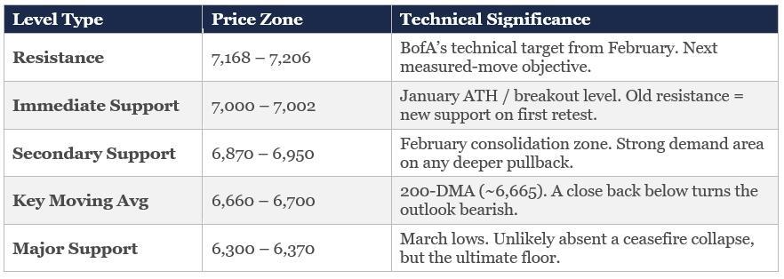 What we are watching most closely over the next two to three weeks isn’t the price level, it’s the breadth confirmation. We want to see the percentage of S&P 500 stocks above their 200-day moving average cross back above 60%, then 70%. We want to see volume improve on up-days and dry up on pullbacks. And we want to see earnings season deliver results that justify the multiple, not just the sentiment reset that a short-covering rally provides.