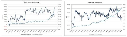 Managed money positioning is at 1y lows in NY, and increasing OI in CMX silver puts is sharply outpacing calls; Friday’s close was the highest OI in silver puts as a % of calls in the last 10 years.