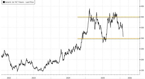 Bloomberg reports this decline was driven by a sharp rebound in exchange inventories, with coffee deliveries doubling over the past two weeks. That restocking has eased fears over near-term supply tightness that previously sent prices surging to nearly $4.5 a pound in 2025.