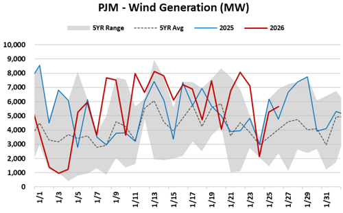 During peak demand periods in PJM – the nation’s largest grid operator – thermal and nuclear generation dominated the dispatch stack. As the cold conditions arrived, natural gas provided 43% of generation and coal contributed 23%, while wind and solar fell to a combined 3-4% of the total fuel mix.