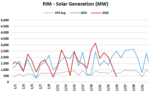 Solar is already a limited part of the PJM fuel mix, and its output of 2,372 MW on Saturday had limited impacts vs thermal, and solar dropped even further yesterday, with output at a low of 442 MW.