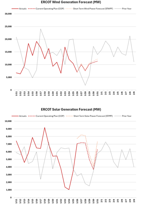 ERCOT wind and solar underperformed, falling well below the levels seen earlier this month.