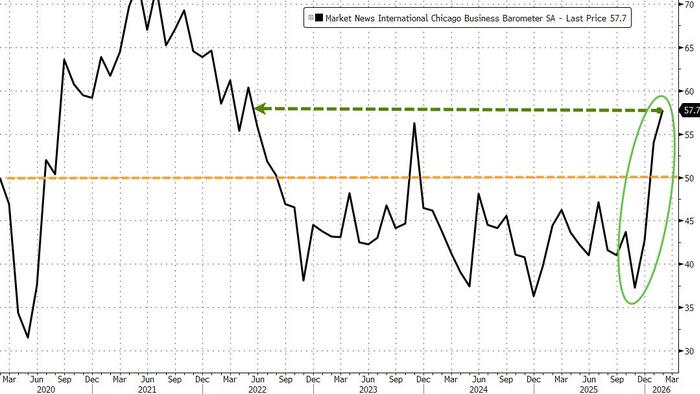 Market News International’s Chicago Business Barometer smashed expectations this morning, print 57.7 – the highest since May 2022 – and above the highest analysts’ expectation.