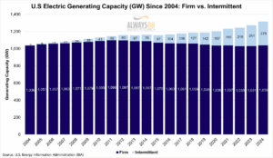 The Energy Bad Boys Substack shows that what has grown in the United States is intermittent power from wind and solar rather than firm, reliable power. In fact, the graph below shows that the firm power in the United States is down to levels last seen in 2004 and that it has been declining since 2011. As a result, even though the grid has more capacity than it did 20 years ago, the growth is made up entirely of intermittent resources that may be producing no power when the grid needs it the most. This is raising concerns with system operators who must ensure the reliability of the grid.