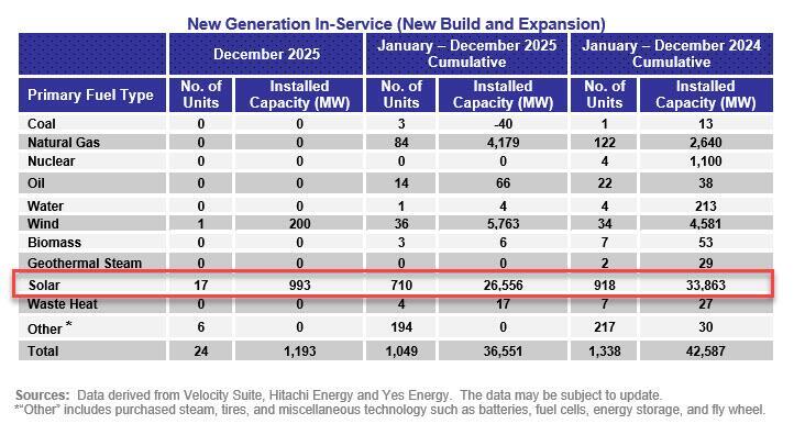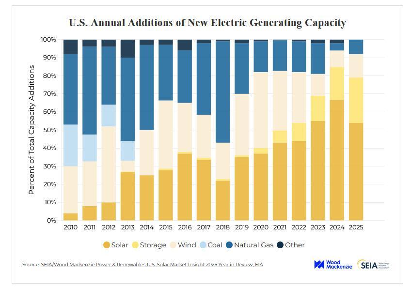 Despite this decrease, solar still led all other generation sources in 2025 installations. As of December, solar now makes up 12.2% of installed generating capacity in the U.S., according to FERC — trailing only natural gas, at 42.2%, and coal, at 14.3%.