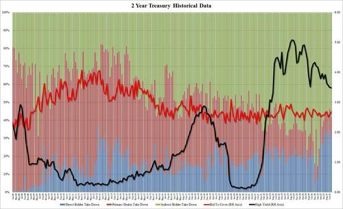 The sale of $69BN in 2 year notes, priced at a high yield of 3.489%, down from 3.504% in October and the lowest since August 2022; it also priced on the screws with the 3.489% when issued.