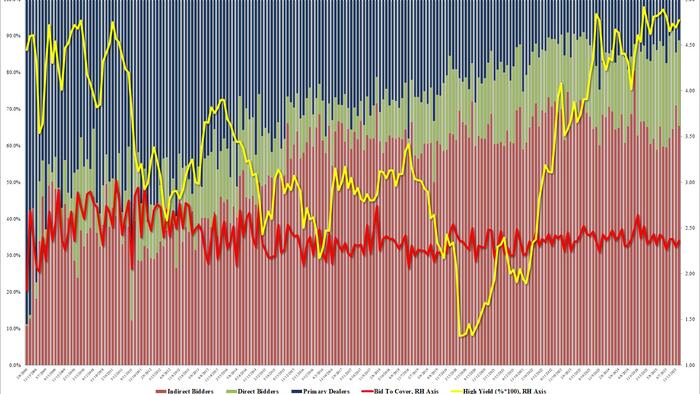 The internals showed continued solid buyside demand: Indirects were awarded 65.4%, down from 71.0% in November. but stripping away that one outlier auction, the foreign demand was the highest since January. And with Directs taking 23.5%, in line with the recent average of 23.9%, Dealers were left with 11.2%, down from 14.5% last month and below the six auction average of 12.5%.