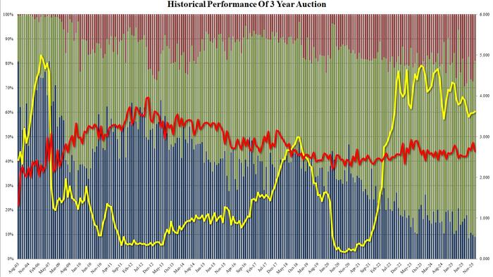 Overall, this was a very solid auction, one which came at just the right time: with 10Y yields surging today just shy of 4.20% before retracing the move and dipping by about 1bp on the solid 3Y auction results.