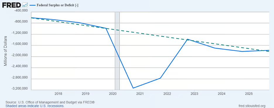 The huge increase in the federal deficit began with the onset of the pandemic, briefly returned to the already-high Obama-Trump trendline in late 2022, and then moved slightly higher than the pre-pandemic trend and stayed there until mid-2025: