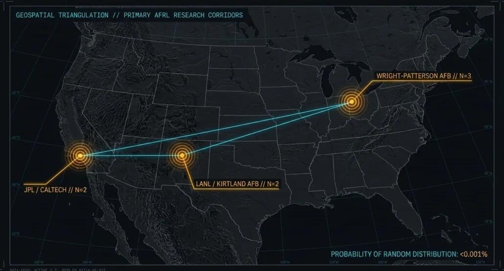 Reza vanished in LA County. Grillmair was killed in LA County. Both in the shadow of the JPL/Caltech corridor where America’s planetary defense infrastructure is built. McCasland vanished in Albuquerque, home of Kirtland AFB and Sandia National Labs. The Wright-Patterson deaths were in Dayton. These are not random locations. They are the three geographic nodes of American defense aerospace research. Southern California. New Mexico. Ohio. The triangle where AFRL lives.