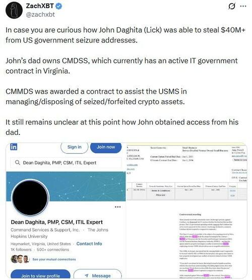In a detailed thread “documenting [his] findings,” ZachXBT claimed that an online figure known as “Lick,” identified as John Daghita, “siphoned tens of millions of dollars in crypto from wallets linked to the US government.”