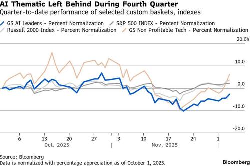 Futures on the US benchmark rose on Friday after the index closed within 0.5% of a fresh record. The gauge is set for its first back-to-back weekly gain since October, signaling that traders are shaking off recent jitters over valuations and the lack of visibility on the economy during the government shutdown. Yet in a notable change from recent trends, tech hasn’t led the recent rally, and with sector participation broadening, the market’s advance may continue – even as the economic data underpinning the move exhibits a “split screen,” with non-jobs data surprising to the upside.