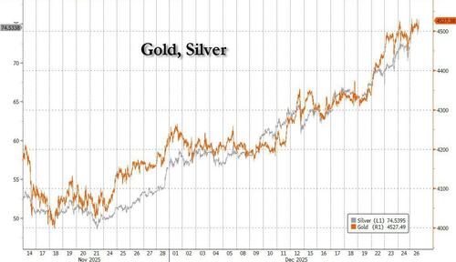 Once again, the bulk of the overnight action was in gold and silver, which jumped as escalating geopolitical tensions and dollar weakness helped extend a historic rally for precious metals. Spot silver advanced for a fifth day, climbing as much as 5.2% to cross $75 an ounce for the first time. Gold, set for its best annual advance since 1979, rose as much as 1.2% to above $4,500 an ounce.