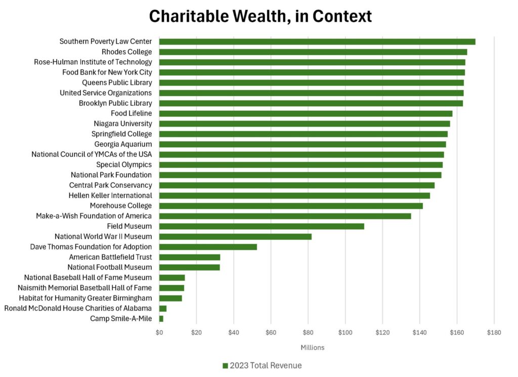 In SPLC’s home state of Alabama, Habitat for Humanity Greater Birmingham built 26 homes and performed “critical repairs” on an additional 296 in 2023, all with revenues less than one-tenth of SPLC’s. SPLC’s revenues are almost 45 times greater than the Ronald McDonald House Charities of Alabama, which provided over 19,000 room nights and over 13,000 individual meals to the families of children requiring hospital care in ’23. SPLC’s ’23 revenues are over 85 times greater than Birmingham-based Smile-A-Mile, which provided recreational programming and support to over 2,500 pediatric cancer patients and family members.