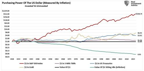 What those promoting the “debasement” argument misunderstand is how economics and modern inflation work. What the chart shows, in today’s economy, is only the loss of purchasing power of idle, or uninvested, dollars. Dollars that sit uninvested lose value relative to inflation over time. That is not a collapse of fiat currency. It is a signal to put capital to work. While the “gold bugs” argue that gold protects against debasement (i.e., inflation), which is true, so do 3-month T-bills and US Treasury bonds on a real, inflation-adjusted, total return basis. However, that same $1 invested in the S&P 500 index was by far the best protector of the purchasing power of the U.S. Dollar