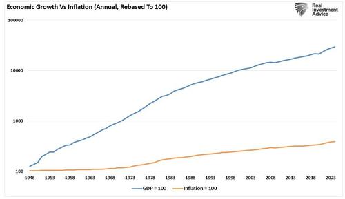 We absolutely agree that investors should invest their “idle” dollars into “risk assets” like bonds, gold, stocks, or Bitcoin to protect their savings from inflation over time. However, the gains in those assets that rise in nominal terms only reflect shifts in relative valuation, not an abandonment of the dollar itself. Furthermore, while those buying into “debasement” fears, mostly due to headlines rather than the facts, seek so‑called “safe havens,” by buying Bitcoin or gold, thinking they are abandoning “fiat” money.