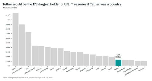 So, what are USD Stablecoins? They are digital tokens designed to maintain a 1:1 peg to the US dollar. Unlike volatile cryptocurrencies such as Bitcoin or Ether, which can swing wildly in price, stablecoins offer price stability by holding reserves of high‑quality liquid assets. The largest examples are Tether’s USDT and Circle’s USDC, which together account for over 90 percent of the USD stablecoin market. For context, as of late 2025, Tether (the issuer of the USDT stablecoin) held over $135 billion in U.S. Treasury securities, ranking it 17th globally among holders of U.S. sovereign debt. Tether’s holdings exceed those of South Korea, Saudi Arabia, Germany, and the UAE.