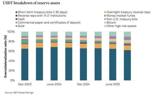 “Bitcoin represents 5.6% of USDT in circulation, exceeding the 3.9% overcollateralization margin associated with a collateralization ratio of 103.9%. A decline in the price of bitcoin or the value of other higher-risk assets could therefore reduce collateral coverage.” – S&P Global