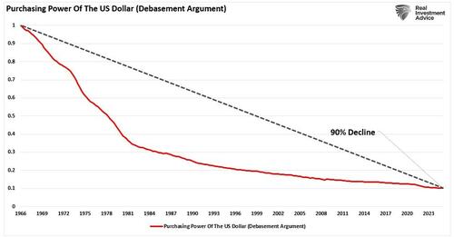 The narrative is seductive: inflation is out of control, the government is printing money, and the dollar is on its last legs. But while there are real risks to watch, most headlines sell fear rather than fact. It’s striking, and those selling gold, silver, or other doomsday assets often use it to scare individuals into taking action. One of their favorite charts used to make the “debasement” case is the classic graph showing that the U.S. dollar has lost 90% of its purchasing power since 1966.”