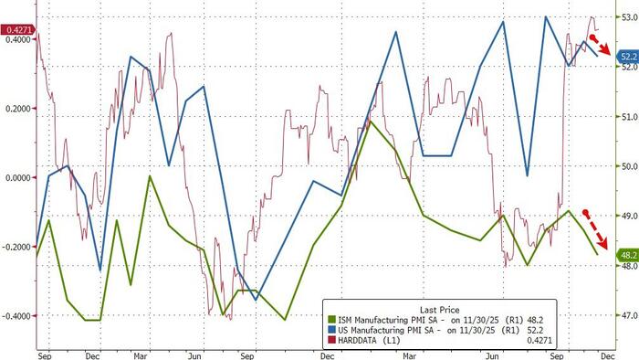 S&P Global’s US Manufacturing PMI BEAT expectations in November but dipped on a MoM basis from 52.5 to 52.2 (still in expansion territory and up from the 51.9 flash print).